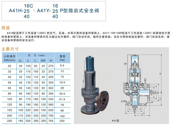 A41H-16C~100型適用于工作溫度≤300℃的空氣、石油、水等介質(zhì)的設(shè)備和管路上。A41Y-16P~100P型適用于工作溫度≤200℃有腐蝕性介質(zhì)的設(shè)備和管路上。當(dāng)設(shè)備和管路內(nèi)壓力超過允許值時,閥門自動開啟,繼而全量排放;當(dāng)壓力降低到規(guī)定值時,閥門自動關(guān)閉,保證設(shè)備和管路的安全運(yùn)行。